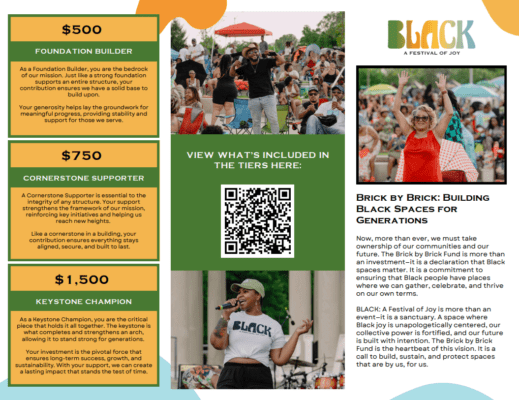 The Brick by Brick Fund is a bold step toward ensuring that Black Joy has a permanent home. Every dollar raised goes toward creating spaces where culture thrives, businesses flourish and future generations can celebrate their heritage with pride. This is not charity—it’s community architecture. And we want you to be a part of it from the very beginning.
