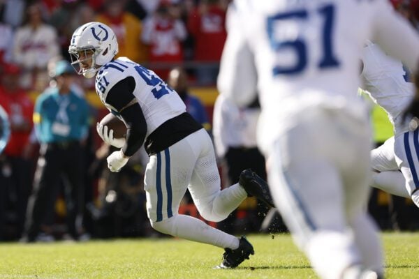 KANSAS CITY, MO – NOVEMBER 23: Indianapolis Colts running back Jonathan Taylor (28) runs up field chased by Kansas City Chiefs safety Bryan Cook (6) during an NFL game between the Indianapolis Colts and the Kansas City Chiefs on November 23, 2025 at GEHA Field at Arrowhead Stadium in Kansas City, MO. (Photo by Jeff Brown/Indianapolis Recorder)