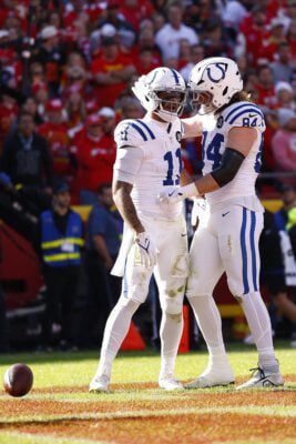KANSAS CITY, MO – NOVEMBER 23: Indianapolis Colts wide receiver Michael Pittman Jr. (11) is congratulated by Indianapolis Colts tight end Tyler Warren (84) on his touchdown during an NFL game between the Indianapolis Colts and the Kansas City Chiefs on November 23, 2025 at GEHA Field at Arrowhead Stadium in Kansas City, MO. (Photo by Jeff Brown/Indianapolis Recorder)