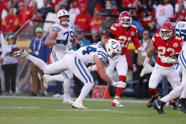 KANSAS CITY, MO – NOVEMBER 23: Indianapolis Colts tight end Tyler Warren (84) falls forward as he runs up field during an NFL game between the Indianapolis Colts and the Kansas City Chiefs on November 23, 2025 at GEHA Field at Arrowhead Stadium in Kansas City, MO. (Photo by Jeff Brown/Indianapolis Recorder)