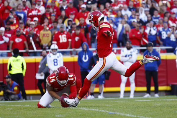 KANSAS CITY, MO – NOVEMBER 23: Kansas City Chiefs place kicker Harrison Butker (7) kicks the field goal to send the game into overtime during an NFL game between the Indianapolis Colts and the Kansas City Chiefs on November 23, 2025 at GEHA Field at Arrowhead Stadium in Kansas City, MO. (Photo by Jeff Brown/Indianapolis Recorder)