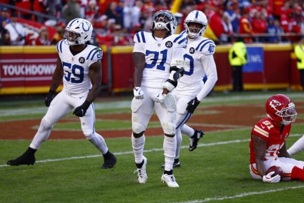 KANSAS CITY, MO – NOVEMBER 23: Indianapolis Colts wide receiver Ashton Dulin (16) is knocked out of bounds by Kansas City Chiefs cornerback Jaylen Watson (35) during an NFL game between the Indianapolis Colts and the Kansas City Chiefs on November 23, 2025 at GEHA Field at Arrowhead Stadium in Kansas City, MO. (Photo by Jeff Brown/Indianapolis Recorder)