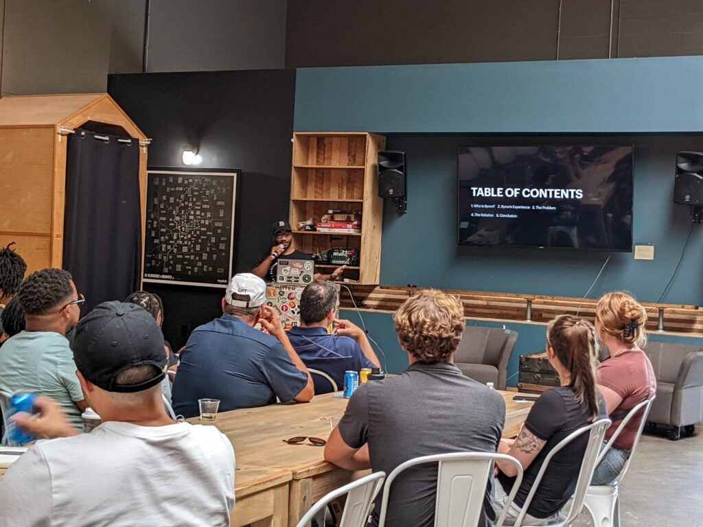 Byron Elliot, an illustrator and senior art director for CVR, speaks at the first “Creatives in Color” series event at The Speakeasy in Broad Ripple on July 13, 2022. (Photo provided by Ashleigh Lay)