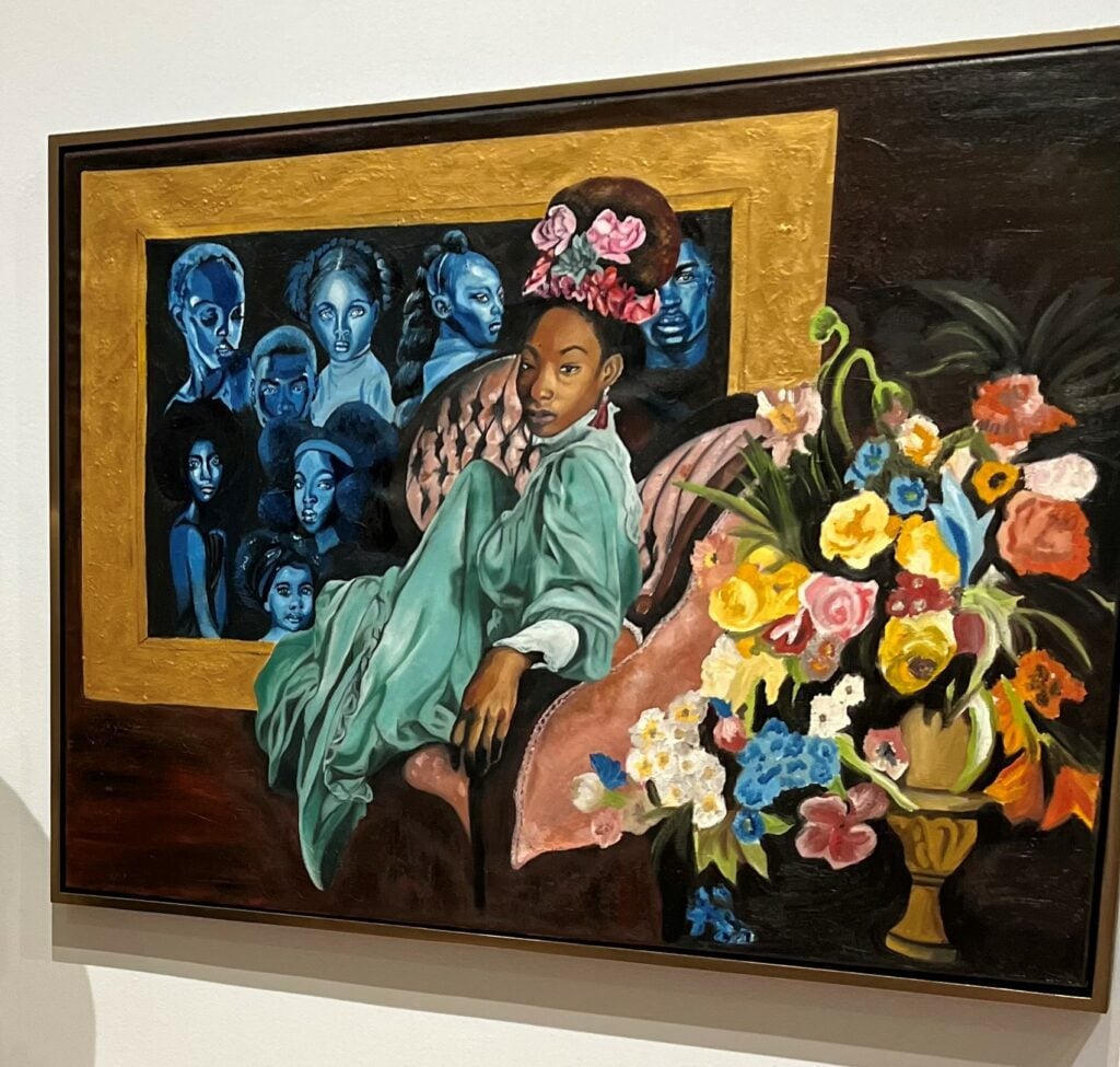 Some of those conversations extend to Nora’s piece, a European art style oil painting featuring a Black woman as the subject with many Black men, women and children behind her. Nora said she gave the painting an African name, “Nobuhle,” meaning “mother of beauty” — and the name given to her during her trip to Eswatini — formerly known as Swaziland — in Africa.
