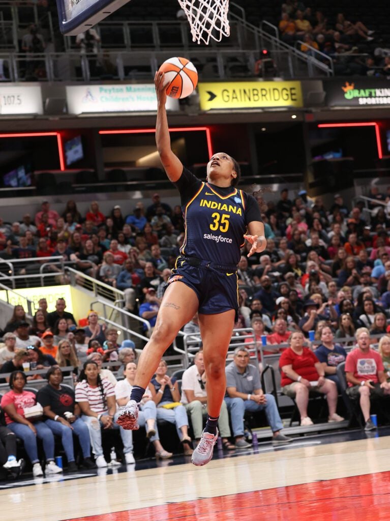Indiana Fever mascot Freddie Fever getting the crowd at Gainbridge Fieldhouse amped up during the game against the Chicago Sky on July 2. (Photo/David Dixon) A member of the United States Armed Services delivering the National Anthem before the Indiana Fever – Chicago Sky game at Gainbridge Fieldhouse on July 2. (Photo/David Dixon)Indiana Fever getting rowdy during the pregame against the Chicago Sky on July 2 at Gainbridge Fieldhouse. (Photo/David Dixon)Indiana Fever All-Star guard and recipient of the 2023 Dawn Staley Award winner Kelsey Mitchell before the game against the Chicago Sky on July 2 at Gainbridge Fieldhouse. (Photo/David Dixon)