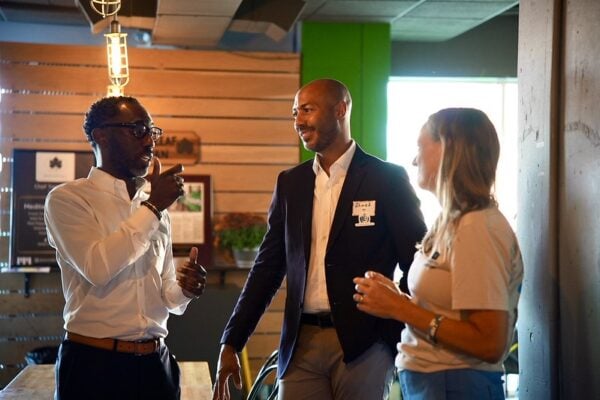 Indianapolis Foundation President and CEO Ahmed Young (center) speaks with community members. (Photo provided/The Indianapolis Foundation)