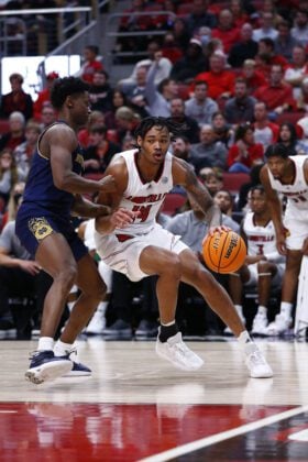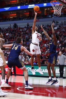 LOUISVILLE, KY - JANUARY 22: Louisville Cardinals guard Dre Davis (14) goes up with his shot from the lane over Notre Dame Fighting Irish guard Trey Wertz (2) during a mens college basketball game between the Notre Dame Fighting Irish and the Louisville Cardinals on January 22, 2022 at the KFC Yum! Center in Louisville KY. (Photo by Jeff Brown/Indianapolis Recorder)