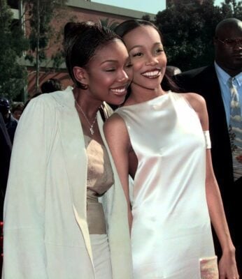 Brandy, left, and Monica arrive at the 41st Annual Grammy Awards at the Shrine Auditorium in Los Angeles Wednesday, Feb. 24, 1999. The two are nominated for Record of the Year with “The Boy Is Mine.” (Photo/Victoria Arocho, AP)