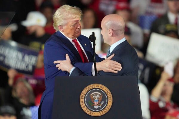 President Donald Trump greets White House deputy chief of staff for policy Stephen Miller as he speaks on his first 100 days at Macomb County Community College Sports Expo Center, Tuesday, April 29, 2025, in Warren, Mich. (Photo/Paul Sancya, AP)
