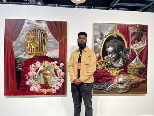 Oil painter Marcus Robins poses with his work at the BUTTER Fine Art Fair in 2025. Robins was inspired by the baroque (Photo/Camike Jones)