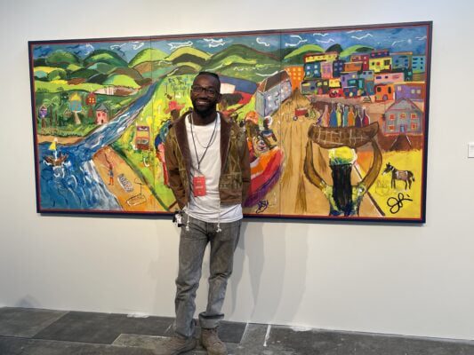 Artist Johnson Simon poses with a painting inspired by his grandmother and their Haitian culture at the BUTTER Fine Art Fair in 2025. (Photo/Camike Jones)