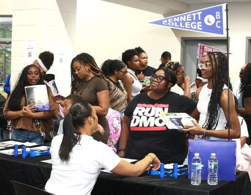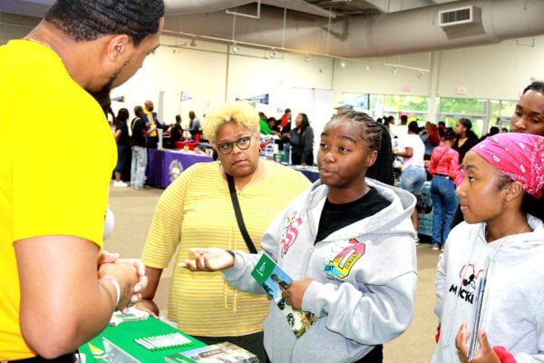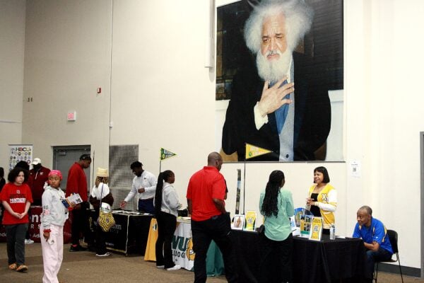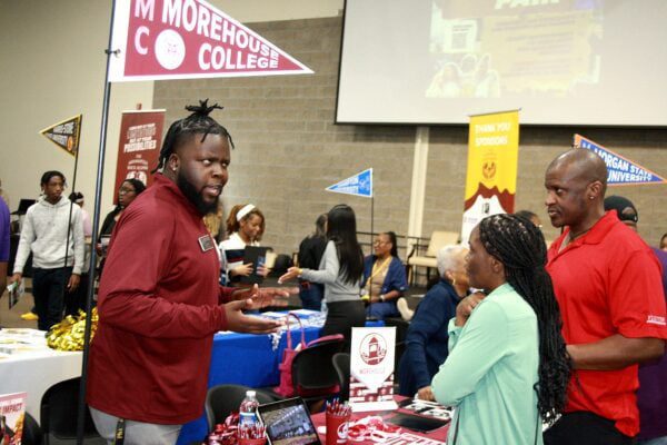 An image of Boniface Hardin, founder of Martin University, overlooks visitors at the college fair. (Photo/Curtis Guynn)Jeremy Jones, a recruiterĀ for Norfolk State University, explains some of the benefits to Angie Guynn, Gianna Peerman and Genesis Watts. (Photo/Curtis Guynn)Stefan Harden, Morehouse College recruiter, talks to SloviaĀ and Ben Kiwanuka on what their student can expect from Morehouse. (Photo/Curtis Guynn)Bennett College, a women’s college in North Carolina, was busy with many visitors.Ā (Photo/Curtis Guynn)