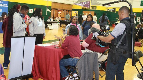 Stevie Ray and Robin Ray visit the Spelman College booth to gather information. (Photo/Curtis Guynn)A videographer captures the college fair. (Photo/Curtis Guynn)