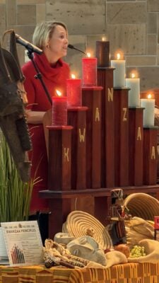 Witherspoon Presbyterian Church Director of Community Engagement Keesha Dixon leads the libation ceremony at the Kwanzaa Community Festival on Dec. 28, 2025 at the Indiana State Museum. (Photo/Camike Jones)