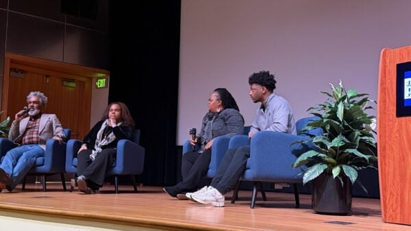 Educator Jeremiah Lockett, parent Latrice Watson, Community Engagement Coordinator Ashley Thomas and Student Instructor Bentley Jones speak during the Exponentia Prime panel at the Kwanzaa Community Festival on Dec. 28, 2025 at the Indiana State Museum. (Photo/Camike Jones)
