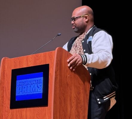 Exponentia Prime founder Patrick Jones, Ed.D. leads the panel discussion at the Kwanzaa Community Festival on Dec. 28, 2025 at the Indiana State Museum. (Photo/Camike Jones)