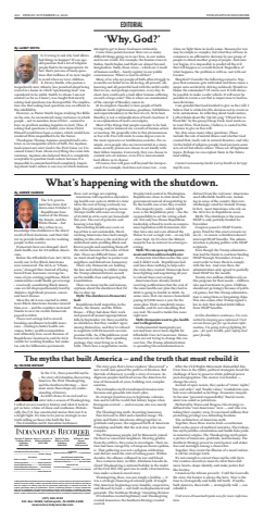 A10 FRIDAY, NOVEMBER 14, 2025 INDIANAPOLIS RECORDERBy LARRY SMITHIs it wrong to ask why God allows bad things to happen? It%u2019s an ageold question that a lot of religious people find to be inappropriate. In fact, that%u2019s just one of many questions that millions of us were taught to avoid when we were children.E. Dewey Smith, who pastors a megachurch near Atlanta, has preached about being reared in a home in which %u201cquestioning God%u201d was considered to be sinful. Smith, to whom I am not related (as far as I know), was taught that merely asking God questions was disrespectful. The implication was that asking God questions was an affront to His infallibility. However, as Pastor Smith began studying the Bible on his own, he encountered many instances in which people %u2013 not to mention Jesus Christ %u2013 seemed to have no problem making inquiries to God. Thus, if asking God questions is sinful, even Jesus Christ Himself would have been a sinner, which would have rendered Him unqualified to be the Savior. Theologian Thomas Aquinas accepted God%u2019s existence as an inarguable article of faith. For Aquinas, God cannot not exist; God is the First Cause (or Uncaused Cause) from whom everything else came into existence. Aquinas also believed that it is completely acceptable to question God%u2019s nature because it is impossible to comprehend God completely. Inquiring about God%u2019s nature is one way in which humans attempt to get to know God more intimately.I raise these points because there are so many difficult things going on in our lives, in our nation and in our world. For example, the famine crises in Sudan, South Sudan and Haiti are almost beyond imagination. Sadly, those crises %u2013 which are a result of human conflict %u2013 barely register in our public consciousness. Where is God in all this?Many of us who are people of faith often struggle to reconcile our belief in an all-loving, all-present, allknowing and all-powerful God with the awful reality that we see, and perhaps experience, every day. In short, how could such a God allow human suffering on such a large scale? This is where an examination of the concept of theodicy comes in.At its simplest, theodicy is how people of faith vindicate God%u2019s righteousness, goodness, faithfulness and superintendency in the face of evil. At its best, theodicy is not a rationalization of God%u2019s inaction; it is an explanation of God%u2019s sovereignty. Most of the things that people consider to be bad, wrong, and/or immoral are a result of human action or inaction. We generally refer to this phenomenon as free will. Free will exists to some degree even in the most repressive or totalitarian societies. For example, even people who are incarcerated in a maximum-security prison can choose to act kindly with their fellow inmates. Conversely, they can choose to commit acts of violence, even if it is unwarranted. God allows us to choose.Of course, free will goes well beyond the interpersonal. For example, God does not cause war %u2013 even when we fight them in God%u2019s name. Reasons for war may be simple or complex, but what they all have in common is an affirmative decision by one group of people to attack another group of people. And once war begins, it is impossible to predict all the evil that will happen as a result thereof. Regardless of what happens, the problem is with us, not with our Creator.Skeptical? Consider the following scenario. Suppose that someone gets inebriated and then causes a major auto accident by driving recklessly. Would we blame the automaker? Of course not. It will always be possible to make a safer vehicle. It will never be possible to create a car that is impervious to bad human decisions. I am grateful that God decided to give us free will. I believe that is related to His decision not to create us to be automatons. In reflecting about God%u2019s nature, I often think about the 70s hit song %u201cI Want You to Want Me%u201d by the group Cheap Trick. God wants us to want Him. That desire, I believe, is rooted in His decision to give us free will. Yes, this raises many other questions. Those include the role of mental illness and whether God created that, God%u2019s role in natural disasters, and why (in the belief of religious people) God prevents some acts of evil but allows others. Those are all legitimate topics. Perhaps we can explore them in the future. God willing. Contact community leader Larry Smith at larry@leaf-llc.com. By ANDR%u00c9 CARSONThe U.S. government has been shut down since October 1. Republicans have control of the House, the Senate, and the White House %u2013 but they refuse to acknowledge this shutdown is the direct result of their decisions, and their failure to provide health care for working people in this country.Democrats have one demand: don%u2019t slash health care for 22 million Americans. Before the Affordable Care Act (ACA), nearly one in five Black Americans were uninsured. The ACA, or %u201cObamacare,%u201d changed that. Instead of being barred from insurance coverage because of pre-existing conditions, Black communities could finally get coverage %u2013 a necessity considering Black Americans are hit disproportionately hard by diabetes, high blood pressure, cancer and heart disease. Since the ACA was enacted in 2010, more Black Americans became insured than ever %u2013 and the numbers increased thanks to new tax credits Democrats passed in 2022. These cost savings led to recordbreaking enrollment in health insurance %u2013 leading to better health outcomes, better wealth accumulation and ultimately lives saved. Because of Republicans%u2019 decision to end the ACA credits for working families, but make tax cuts for billionaires permanent, these cost savings are expiring. Americans will experience skyrocketing health care costs in 2026 at a time when the cost of living is already too high. The job market is getting worse. Trump%u2019s tariffs will cause an ave
