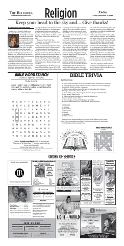 Friday, November 14, 2025B Sectionindianapolisrecorder.comORDER OF SERVICECONTACT US: Monday-Friday 8:30 AM - 5:30 PMOffice: (317) 591-5050 | easternstarchurch.orgROCK CITY MONDAYSAges 12-18 | Main Campus5-8 PM | Registration requiredNOONDAY BIBLE STUDYMain CampusWednesdays | NoonFAMILY WORD NIGHTMain Campus | Wednesdays7 PM | Classes for everyoneJOIN US FORROCK FRESH MARKET HOURS: Monday - Friday 8 AM - 6 PMSaturday and Sunday 11 AM - 4 PMSenior Pastor Jeffrey A. Johnson, Sr. & Lady Sharon A. JohnsonONE CHURCHTHREE LOCATIONSFishers Campus: ........................9:15 AMCooper Road Campus: ...............10:45 AMMain Campus: ............................12:15 PMVisit our website or ESC App and click Watch Live.%u2022 Live stream Sunday services at 9:15 AM, 10:45 AM & 12:15 PM%u2022 Sermons on demand anytime%u2022 Sermon Rebroadcasts: Thursdays at 7 PM and Saturdays at 11 AMTo give, click the GIVE button on our website. Download via Google Play, Windows Phone, and Apple App Store.TUNE IN Life-changing broadcasts available via:WTLC-AM 1310/92.7 FM (Radio) SermonsTuesday, Wednesday, Thursday at 9:15 AMAPPLE TV, ROKU, AMAZONConnect for live stream or on demandFishers Campus8850 E. 106th St. Fishers, INCooper Road Campus5805 Cooper Rd. Indpls, INMain Campus5750 E. 30th St. Indpls, INONE CHURCH THREE LOCATIONSFriendship Missionary Baptist Church1302 North GoodletIndianapolis, Indiana 46222Pastor, Rev. Ronald Covington Sr.Sunday Morning ServiceFulfillment Hour (Sunday School) 9:30a-10:30areMorning Worship 10:45WednesdaysMorning Prayer Meeting & Bible Study, 9:30 a.m.Prayer & Praise on Purpose/Bible Study, 6:30p.m.Pleasant Union Missionary Baptist Church1202 Eugene St. Indpls, Indiana 46208phone 925-4382 fax 283-5615Sunday Worship10:50 amSunday School9:15 amMonday Morning Prayer6:00amWed. Bible Study12:00 noon & 7:00pmThurs. Family Living7:00pmFri. Victory Over Addictions7:00pmPastor Nello A. Holman and First Lady Kay HolmanVisit our website!www.indyrecorder.comVisit our website!BIBLE TRIVIA By ANGELIQUE WALKER-SMITHPsalm 123:1: LORD, I look up to you, up to heaven, where you rule. Recently I boarded a small elevator and was delighted to join a young mother with her baby in a stroller. Soon a gentleman joined us. During the short ride, the baby took the pacifier from her mouth, looked into the eyes of each of us and pointed her finger upwards for us to look up. Her mother said she always does that! I found this to be a mystical moment led by the baby. While cherishing the encounter, I suddenly remembered there would be multiple national guard personnel, police and security to greet me at the top of my long escalator ride. As I walked in their presence, I found encouragement from the sacred moment of the baby leading us. This memory was furthered when my mind and heart remembered one of my favorite groups %u2013 Earth, Wind, and Fire %u2013 and their song, %u201cKeep Your Head to the Sky.%u201d%u201cKeep your head to the sky%u2026You gave me the will to be free, Purpose to live is reality%u2026Hey and I found myself never alone, cause you need faith to understand...%u201dIn this season of so much uncertainty in our lives, I also think about the lives of farmers, both locally and globally, living with the uncertainty of being able to feed us and of the profound suffering of vulnerable populations and of food systems under threat of funding cuts, climate change, and conflicts. Giving thanks can be hard as we approach this holiday season. With the increased presence of the military and security personnel locally, and with at least forty-five conflicts and%u00a0wars globally, we have reason to be troubled. Still, we are encouraged to look up and rise above the pain and evils of this world. The%u00a0baby in the elevator is on her mission to remind us to do this, as is the song. The Christ child who we anticipate again in the season of Advent 2025, starting November 30th, also reminds us to look up. The Bible tells us that after the Christ child was born, the Holy Family escaped to the African country of Egypt for refuge from the King Herod, who sought to have the child killed. Sadly, this is the story today for so many children who suffer at the hands of violent governments and movements. Our recent Pan Women of Faith/Pan African Women%u2019s Ecumenical Empowerment Network conference reminded us that children and youth, like Pan African girls, still have the courage to be resilient and truthtellers, just like in the Bible and baby in the elevator. Advocacy with and for babies, children, mothers, fathers, and families is one of the ways we accept and renew our call to be divinely human through the eyes of faith. May you always be reminded by the child inside you to look up and walk faithfully, especially as we approach this holiday season which includes Thanksgiving and the beginning of Advent. Bread for the World hopes that our new Advent devotional, Advent People in Uncertain Times: A Bread for the World Devotional, can be a source to accompany you during these uncertain times. Rev. Dr. Angelique Walker-Smith is senior associate for Pan African and Orthodox Church engagement at Bread for the World.Keep your head to the sky and%u2026 Give thanks! By Wilson Casey 1. Is the book of Nathan (KJV) in the Old or New Testament or neither?2. Though Paul was born in Tarus of Cilicia, where was he brought up? Jerusalem, Shiloh, Jericho, Damascus3. What 8-year-old boy served as king of Jerusalem for 100 days? Shamgar, Jehoiachin, Adino, Sisera4. From John 5, who stirred up the water at the pool of Bethesda? Priest, Angel, Wind, Jesus5. Who was Jacob%u2019s firstborn as found in Genesis 35? Reuben, Ehud, Joshua, Elah6. From Judges 1, who fed 70 kings at his table? Benaiah, Nebuchadnezzar, Adoni-bezek, MephiboshethANSWERS:1) Neither,2) Jerusalem, 3) Jehoiachin, 4) Angel, 5) Reuben, 6) Adoni-bezekSharpen your understanding of scripture with Wilson Casey%u2019s latest book, %u201cTest Your Bible Knowledge,%u201d ava