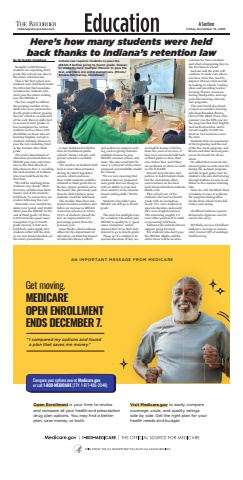 Friday, November 14, 2025AfiSectionindianapolisrecorder.comOpen Enrollment is your time to review and compare all your health and prescription drug plan options. You may fi nd a better plan, save money, or both. Visit Medicare.gov to easily compare coverage, costs, and quality ratings side by side. Get the right plan for your health needs and budget.%u201cI compared my options and found a plan that saves me money.%u201dGet moving.MEDICAREOPEN ENROLLMENT ENDS DECEMBER 7.AN IMPORTANT MESSAGE FROM MEDICARECompare your options now at Medicare.gov, or call 1-800-MEDICARE (TTY: 1-877-486-2048)By MJ SLABY, ChalkbeatRoughly 3,000 Hoosier students are repeating third grade this school year, due to the state%u2019s retention law.This is the first school year students were held back under the 2024 law that mandates retention for students who don%u2019t pass the state%u2019s reading test, the IREAD-3.The law sought to address the growing number of students who were promoted to fourth grade without passing the test, which is an indicator of the early literacy skills tied to success in later grades. It has exemptions for certain students such as those with disabilities or those who are learning English, and gives students multiple chances to pass the test, including twice in the summer after third grade. The state%u2019s department of education presented data on IREAD pass rates and retention to the State Board of Education on Nov. 5, revealing the total number of students who were held back for the first time. %u201cWe will be watching those students very closely,%u201d State Secretary of Education Katie Jenner said of the students held back, %u201cto ensure they are readers following this year.%u201dStatewide, over 84,000 students were tested, and 10,663 didn%u2019t pass the IREAD by the end of third grade. Of those, 6,950 received a good cause exemption to go to fourth grade anyway, 3,040 were held back, and roughly 673 students either left the state or are now homeschooled, per the state%u2019s presentation.A state dashboard with this data for traditional public schools, charter schools, and private schools is available online. The number of students held back is lower than estimates during the 2023 legislative session, which said more than 7,000 students could be retained in third grade due to the law, Jenner pointed out to the board. She previously said that she didn%u2019t believe many students would be held back.The smaller-than-first-estimated retention numbers also follow an increase in IREAD scores last school year where 87.3% of students passed the test, an improvement of 5 percentage points from the previous year. Anna Shults, chief academic officer for the department of education, credited the impact of statewide literacy efforts and policies to support reading, such as giving students multiple chances to pass IREAD, summer school, and more. She also noted that literacy is a key part of the state%u2019s proposed accountability model for schools. %u201cWe are now ensuring that students that are promoted onto grade four are doing so with an ability to read and show mastery of key foundational reading skills,%u201d Shults said.Students who didn%u2019t pass IREAD can still go to fourth gradeThe state has multiple ways for a student who didn%u2019t pass IREAD to qualify for a %u201cgood cause exemption%u201d and be deemed that it%u2019s in their best interest to go to fourth grade.Those are if a student is in special education, if they are an English learner with less than two years of services, if they were previously held back in third grade or more than once before that, and if they are proficient or above in math on the ILEARN. Schools have the laws and policies to hold students back, but the exemptions allow conversations on the local level about individual students, Shults said.This school year, of the students who went to fourth grade with an exemption, nearly 75% were students in special education and nearly 24% were English learners. The remaining roughly 1% were either proficient in math or previously held back.Indiana will continue literacy support going forwardFor students who don%u2019t pass the IREAD, Shults said the state%u2019s focus will be on interventions for those students and what is happening day-today for them in school.And she said the state will continue to make sure educators have what they need to improve literacy rates overall by looking at schools%u2019 reading plans and providing teacher training, literacy resources, testing checkpoints, and supports like tutoring and summer programs.The state board also heard a report on summer learning labs from Brandon Brown, CEO of The Mind Trust. This summer was the fifth year for the program that does English and math education, and it served roughly 12,000 students in 144 locations across the state. Students take an assessment at the beginning and the end of the five-week program, and Brown said data showed gains across the board for all students. He added that research also showed gains on state tests following the summer program, and the largest gains were for students who also did tutoring through Indiana Learns in addition to the summer learning labs.Next, he said, the Mind Trust is looking at ways to replicate the program during other breaks from school in the fall, winter, and spring.Chalkbeat Indiana reporter Aleksandra Appleton contributed to this story.MJ Slaby oversees Chalkbeat Indiana%u2019s coverage as bureau chief. Contact MJ at mslaby@chalkbeat.org.Here%u2019s how many students were held back thanks to Indiana%u2019s retention lawIndiana law requires students to pass the IREAD-3 before going to fourth grade. However, students have multiple chances to pass the test, and there are some exemptions. (Photo/Amelia Pak-Harvey, Chalkbeat)