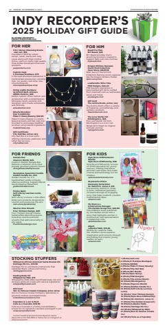 A8 FRIDAY, NOVEMBER 14, 2025 INDIANAPOLIS RECORDERBy HANNA RAUWORTHhannar@indyrecorder.comINDY RECORDER%u2019S2025 HOLIDAY GIFT GUIDEFOR HER3-N-1 Honey Cleansing Grains Jael LLC, $10Founded in 2013 by sisters Jerilyn, Janet, Jeana and Judy Lewis along with their mother Grova, Jael LLC crafts high-quality shea-butter-based personal-care products.jaelproducts.comCustom Caps C Monique Boutique, $75C Monique Boutique specializes in handcrafted accessories including hats, loc jewelry and other oneof-a-kind pieces.cmoniqueboutique.shopString Lights Necklace by Entoto Beth Artisans ADWA Fashion, $48ADWA Fashion ofi ers fashion and accessories with a contemporary Ethiopian touch, working with designers who create sustainably and ethically.adwafashion.comBlissful Brooklyn Hair Conditioner Make It Classy Beauty, $22.99Make It Classy Beauty is a plantbased skincare and hair-care line founded to encourage healthier routines using natural ingredients.makeitclassy.orgGift Certifi cate City Nail Bar, prices varyCity Nail Bar is a local salon ofi ering manicures, pedicures and other nail services.citynailbar.comFOR HIMBaudi For Men BIY Baudi, $25BIY Baudi provides men%u2019s grooming products created to support daily self-care routines.biybaudi.comDragon Rimless Eyewear, David Ford Collection Spex Savvy, $649.99Spex Savvy%u2019s David Ford Collection features luxury eyewear like the Dragon Rimless model.spex-savvy.comLeatherette Wine Tote PSR Designs, $24.44PSR Designs specializes in personalized gift items crafted from materials such as leatherette, wood and metal.psrdesigns.comGift Card The Aroma Room, prices varyThe Aroma Room ofi ers a variety of fragrance, aromatherapy and wellness products.thearomaroom.comThe Luxe Starter Kit ROJOrganics, $35The Luxe Starter Kit from ROJOrganics is a 2-in-1 set designed to begin an organic skincare journey.rojorganics.comFOR FRIENDSSample Box Popcorn World, $45Popcorn World%u2019s Sample Box features a selection of its most popular gourmet popcorn fl avors.doingtheworldafl avor.comEucalyptus Spearmint Candle Golden Candle Co., $10Golden Candle Co. is a handcrafted candle company ofi ering soothing, fragrant blends like Eucalyptus Spearmint.goldencandleco.comMonky Balm Soft Life by Luscious Lonie,$47.99Soft Life by Luscious Lonie ofi ers body care products designed to nourish and moisturize the skin.stan.store/pynkmonkyWarrior Diva Wreath Four Thirteen Design, $40Four Thirteen Design creates handcrafted decorative pieces, including colorful and bold wreaths that add personality to any space.fourthirteendesign.comFOR KIDSNyla Nova STEMventures BundleNyla Nova STEMversity, $30Nyla Nova STEMversity focuses on STEM education for young learners, ofi ering interactive activities and books that make science and technology fun for children.nylanovastemversity.comExponentia Prime: Geometry Generation Dr. Patrick H. Jones II, $15This book by Patrick H. Jones II, Ed.D., introduces geometry concepts through an engaging story that helps students visualize mathematical ideas.amazon.comMy Mom is a Construction Manager The Darden Group LLC, $22.99This children%u2019s book published by The Darden Group tells a story that highlights women in construction and representation in leadership roles.akilahdarden.comAlpert LaNesha Tabb, $15.26Written by LaNesha Tabb, this children%u2019s book explores imagination and curiosity through storytelling that inspires young readers to learn.amazon.comSTOCKING STUFFERSWhimsical African American Santa Enamel Pin Heritage Pin Co., $19.98Heritage Pin Co. produces enamel pins that celebrate Black culture and history.heritagepinco.comHealing Body Oil Whipped by M&S, $15Whipped by M&S ofi ers handmade body oils and skincare products made with natural ingredients.whippedbymands.comGift Card Not As Famous Cookie Company, price variesNot As Famous Cookie Company specializes in gourmet cookies and baked treats.notasfamouscookieco.comCupcakes in a Jar 4-Pack Cute as a Cupcake, $38.50Cute as a Cupcake is a family-owned bakery known for its signature cupcakes packaged in jars.cuteasacupcake3.comContact Health & Environmental Reporter Hanna Rauworth at 317-762-7854 or follow her on Instagram at @hanna.rauworth.1 (Photo/Jael LLC)2 (Photo/C Monique Boutique)3 (Photo/ADWA)4 (Photo/Make It Classy Beauty)5 (Photo/City Nail Bar)6 (Photo/BIY Baudi)7(Photo/Spex Savvy)8 (Photo/PSR Designs)9 (Photo/The Aroma Room)10 (Photo/ROJOrganics)11 (Photo/Popcorn World)12 (Photo/Golden Candle Co.)13 (Photo/Soft Life by Luscious Lonie)14 (Photo/ Four Thirteen Design)15 (Photo/Nyla Nova STEMversity)16 (Photo/Dr. Patrick H. Jones II)17 (Photo/The Darden Group LLC)18 (Photo/LaNesha Tabb)19 (Photo/Heritage Pin Co.)20 (Photo/Whipped by M&S)21 (Photo/Not As Famous Cookie Co.)22 (Photo/Cute as a Cupcake)1. 2.3.4.5.6.7.8. 9.10.11.12.13.14.15.16.17.18.19.20.21.22.