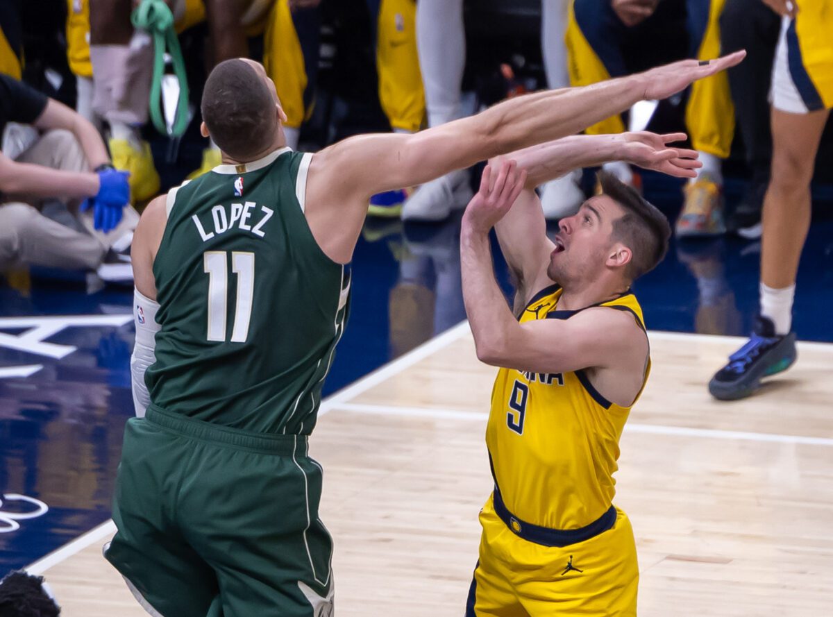 Milwaukee Bucks center Brook Lopez (11) closes out on Indiana Pacers point guard T.J. McConnell (9) during Game 4 of the first round in the Eastern Conference of the 2024 NBA Playoffs on April 28, 2024 at Gainbridge Fieldhouse in downtown Indianapolis, Indiana. (Photo/Walt Thomas)Milwaukee Bucks guard Pat Connaughton (24) uses a screen set by Bucks teammate Khris Middleton to avoid the contact of Indiana Pacers point guard Tyrese Haliburton during Game 4 of the first round in the Eastern Conference of the 2024 NBA Playoffs on April 28, 2024 at Gainbridge Fieldhouse in downtown Indianapolis, Indiana. (Photo/Walt Thomas)Indiana Pacers forward Myles Turner (33) throws down the slam dunk over Milwaukee Bucks center Brook Lopez (11) during Game 4 of the first round in the Eastern Conference of the 2024 NBA Playoffs on April 28, 2024 at Gainbridge Fieldhouse in downtown Indianapolis, Indiana. (Photo/Walt Thomas)Indiana Pacers forward Myles Turner (33) throws down the slam dunk over Milwaukee Bucks center Brook Lopez (11) during Game 4 of the first round in the Eastern Conference of the 2024 NBA Playoffs on April 28, 2024 at Gainbridge Fieldhouse in downtown Indianapolis, Indiana. (Photo/Walt Thomas)